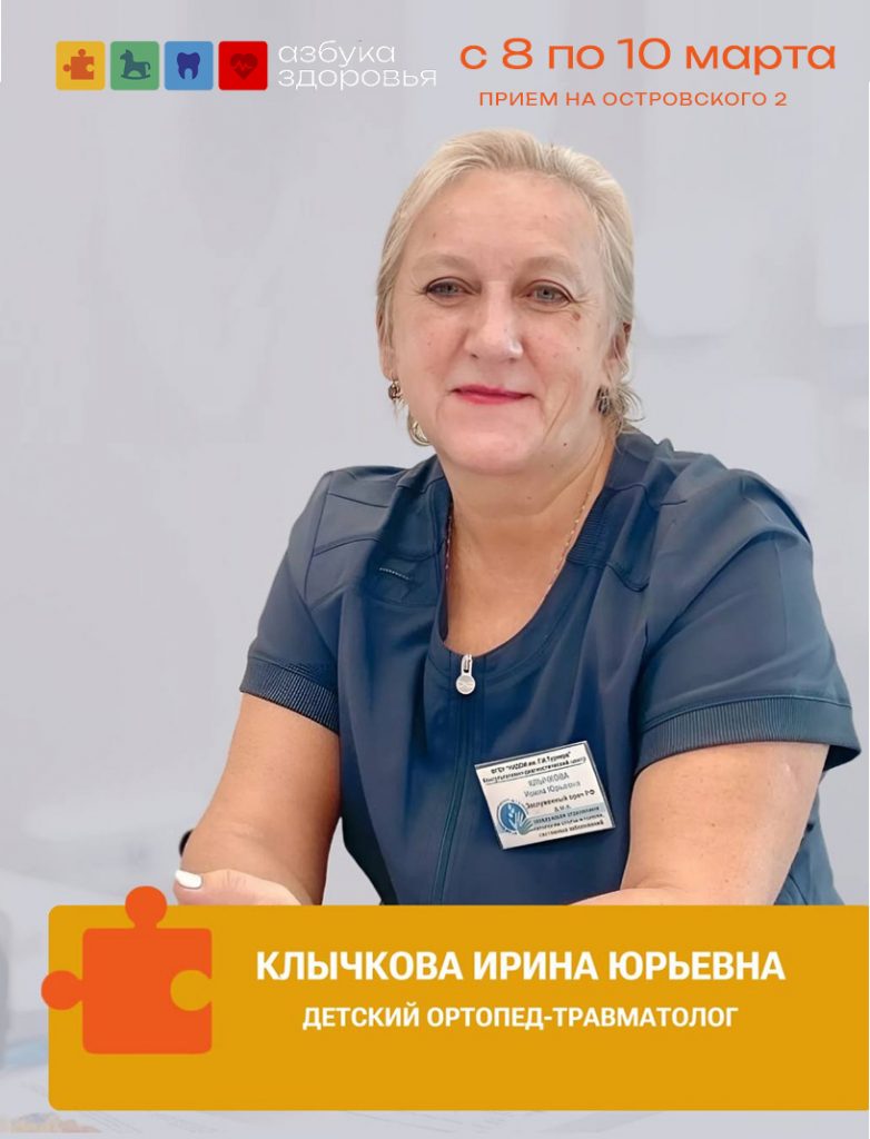 Клычкова Ирина Юрьевна– заведующая ЕДИНСТВЕННОГО в России специализированного детского ортопедического отделения, занимающегося лечением тяжёлых деформаций нижних конечностей в НМИЦ им. Г.И. Турнера, г. Санкт-Петербург